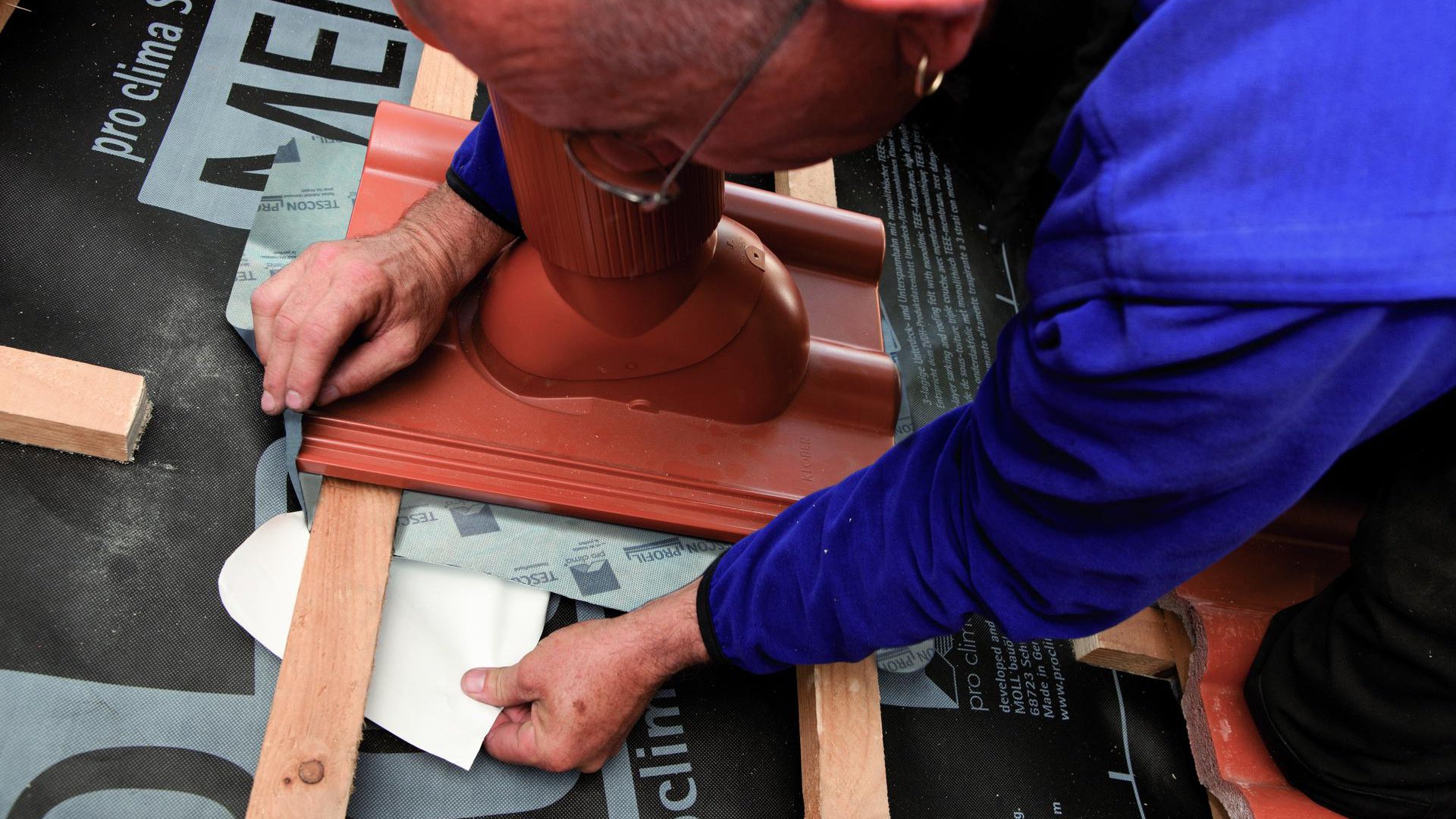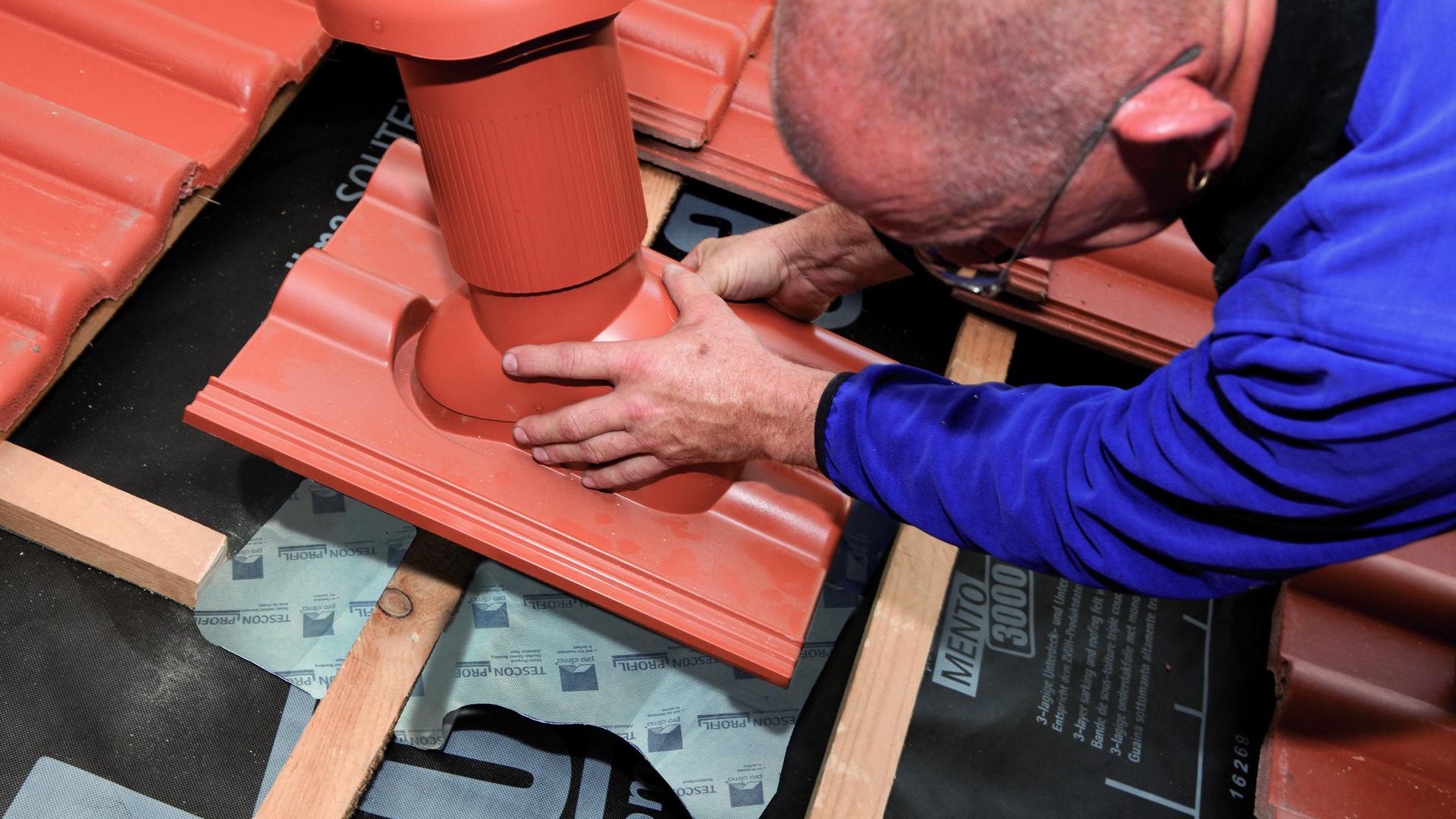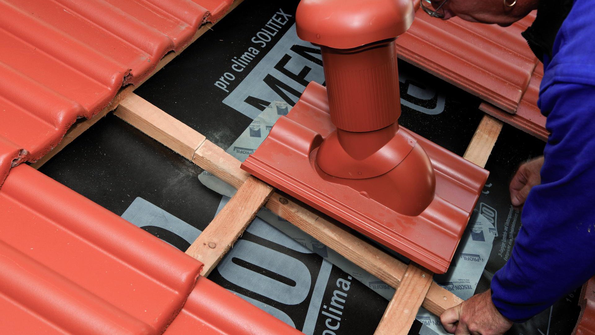 Guide the vent pipe through the underlay membrane. Align the vent with the grommet on the tile batten to fit in with the existing row of roof tiles. Guide the grommet under the tile battens.