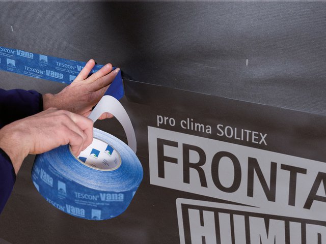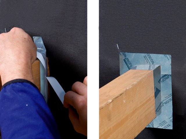 Tape the membrane to the window frame using TESCON PROFECT to ensure a windtight seal. Thanks to the split release paper it is possible to stick the tape first to the membrane and then, subsequently, to the window.