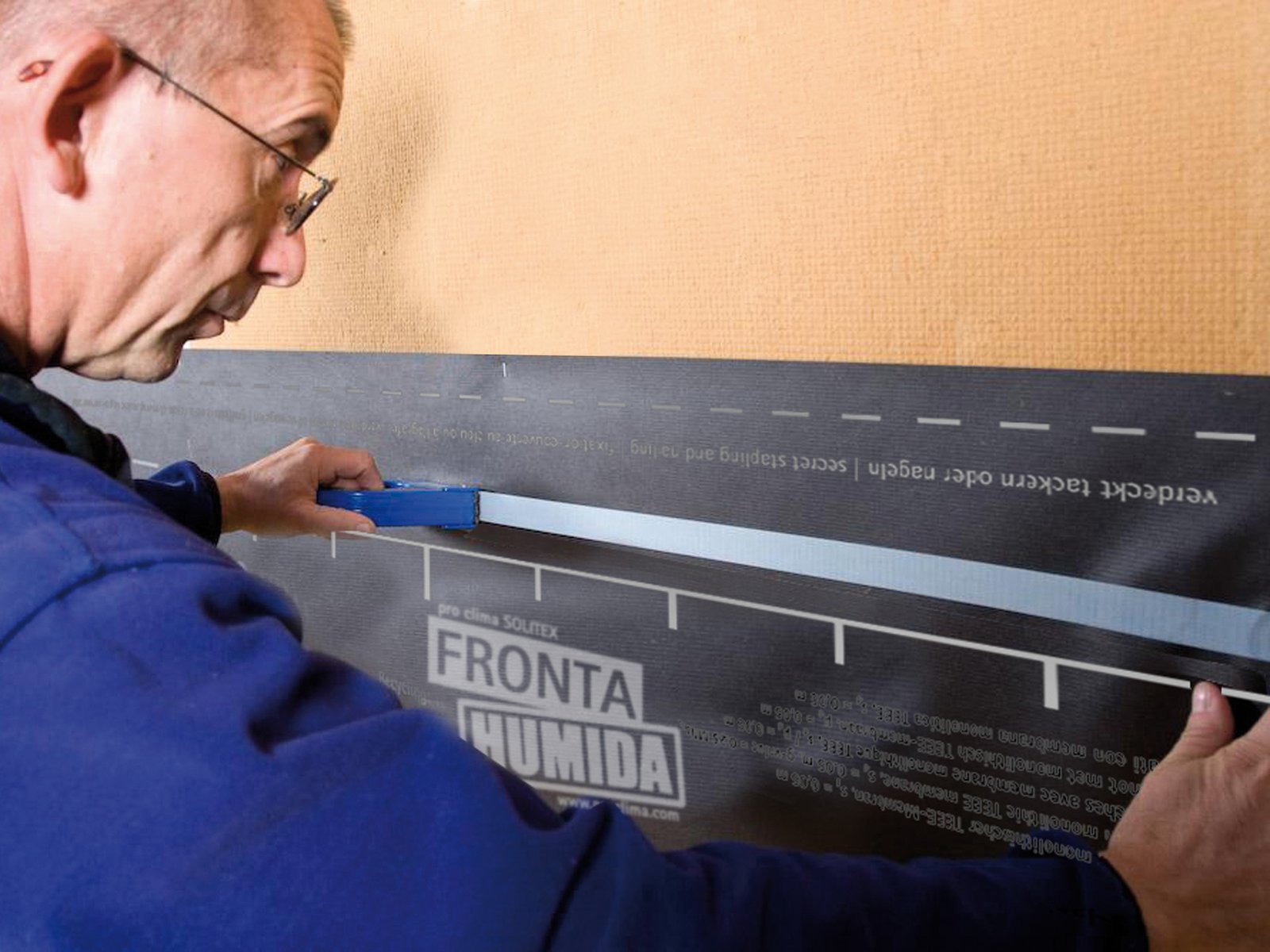Tape TESCON VANA or TESCON INVIS adhesive tape centrally on the overlap and stick it down bit by bit so that it is load and wrinkle free. Rub the tape firmly using the PRESSFIX to secure the adhesive bond. Ensure that there is sufficient resistance pressure.