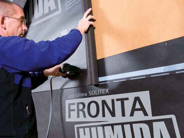 Roll out the membrane horizontally, align it horizontally and attach it initially in the overlap area in a manner that protects against moisture entry using galvanised staples (type D) that are at least 10 mm (⅜”) wide by 8 mm (⁵⁄₁₆”) long (16 mm (⅝”) in the case of wood fibreboards) at separation distances of 10-15 cm (4”-6”) (alternatively, use DUPLEX double-sided adhesive tape, pre-treat with TESCON PRIMER). Additional securing with thermally decoupled screw anchors or laths on the wood fibreboard.
