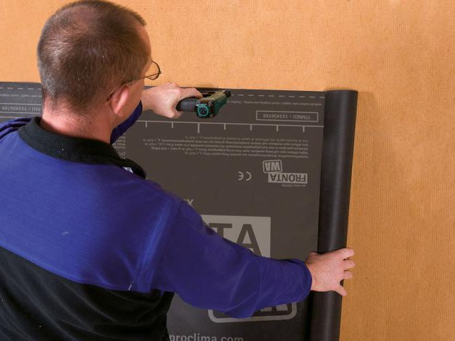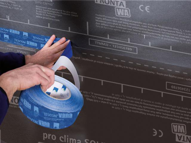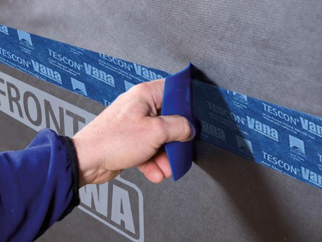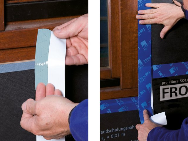 Tape the membrane to the window frame using TESCON PROFECT to ensure a windtight seal. Thanks to the split release paper it is possible to stick the tape first to the membrane and then, subsequently, to the window. Alternatively use TESCON VANA or TESCON INVIS.